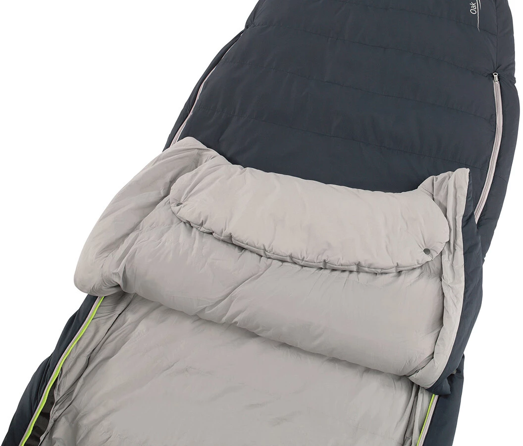 Les sacs de couchage confortables de la gamme Oak impressionnent par leur forme en sablier élégante, qui promet un confort plus souple au niveau des épaules et des genoux. Un équilibre parfait entre les performances d’isolation et la taille du sac est obtenu en combinant les fibres innovantes Isoball sous l’utilisateur et un mélange de duvet Isoball au-dessus de l’utilisateur, ce dernier offrant un meilleur volume et retenant mieux la chaleur corporelle. Deux fermetures à glissière décalées courent le long du bord supérieur afin que les dormeurs latéraux ne s’allongent pas directement dessus. Ils permettent une thermorégulation souple, tandis que le rabat pratique du haut est une option populaire pour les nuits plus froides. L’élégant tissu extérieur présente le motif matelassé caractéristique d’Outwell. Pour un confort douillet comme à la maison, chaque modèle est équipé d’une capuche extra profonde, d’une taie d’oreiller et d’un sac de compression.