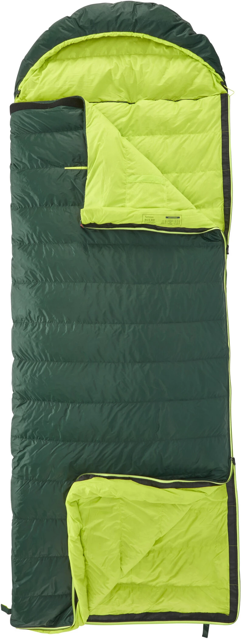 Le Tension Brick 400 est un sac de couchage en duvet moyennement léger, spacieux et confortable qui offre une protection complète contre le froid. Choisissez ce sac de couchage de forme rectangulaire si vous préférez un confort spacieux pendant la nuit avec un grand espace pour les jambes et une grande liberté de mouvement. La capuche technique et amovible peut être utilisée des deux côtés et le sac de couchage peut être rapidement et facilement combiné avec un sac de couchage similaire grâce à la longue fermeture éclair. La fermeture à glissière à double sens, qui s’étend sur toute la longueur du sac de couchage, est dissimulée par une chambre à duvet longitudinale qui garde la chaleur à l’intérieur du sac de couchage, là où vous pouvez en profiter.